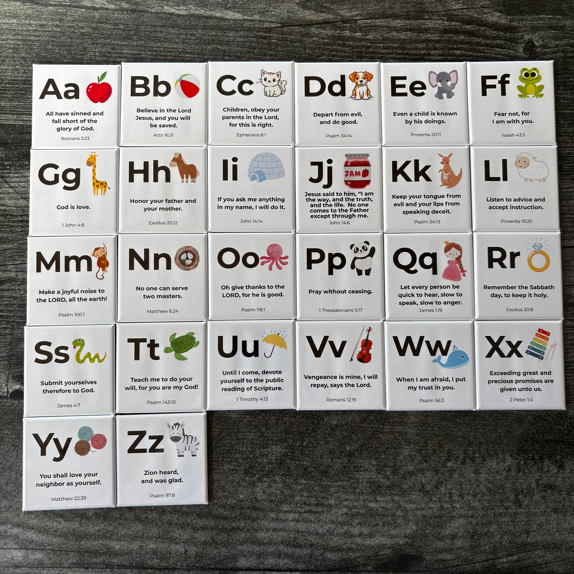 Set of 26 magnets, each is 2"x2". Scriptures are taken from KJV and ESV translations.