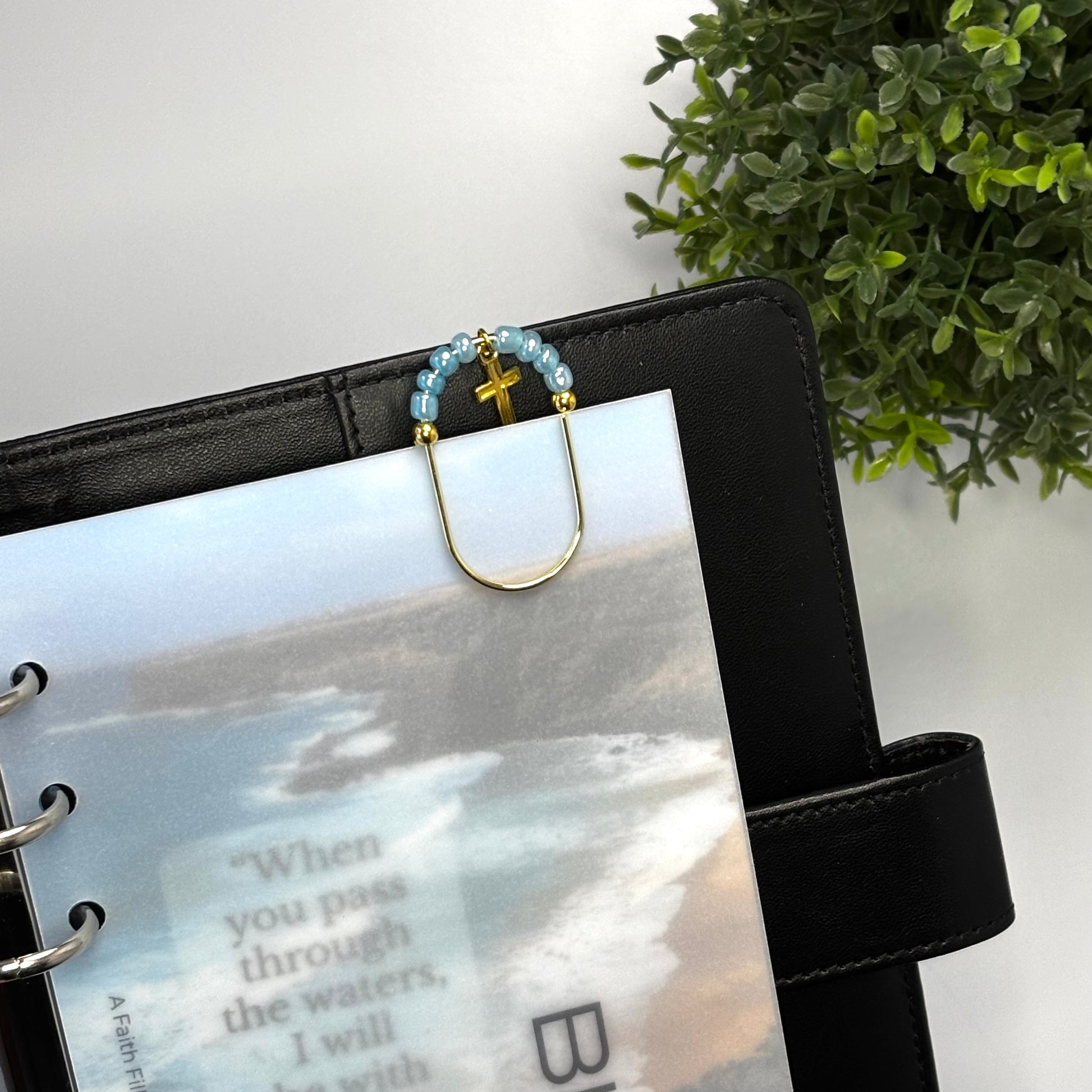 Each paperclip is handmade with a gold finish, finished with a colored glass and gold bead accents and a gold cross charm. It is the perfect little detail for marking a dashboard, highlighting a section, or adding a polished look to your binder.