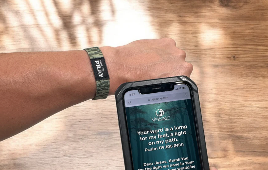 Versible® is excited to introduce our new line of Tap To Pray™ wristbands. No app required, just tap the patch with your smartphone to receive a new Bible verse and prayer every day. We've also added the ability for you to receive a new verse and prayer anytime you want, simply hit the "New Verse" link on the bottom of the page!